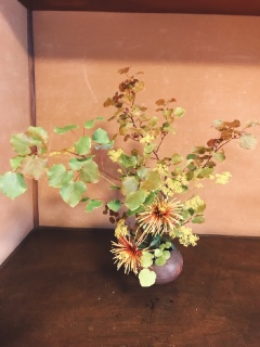 花材:みつまた(黒、白)、南天洞、あぶらどうだんの紅葉、けいとう